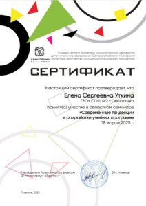 Уткина Елена Сергеевна,учитель труда, приняла участие в областном семинаре «Современные тенденции в разработке учебных программ»